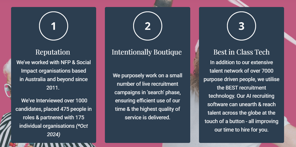 Helping charities, NFPs, Education, B-Corps and other businesses 'for good' across Australia to build high-performing teams, without the hiring headaches.